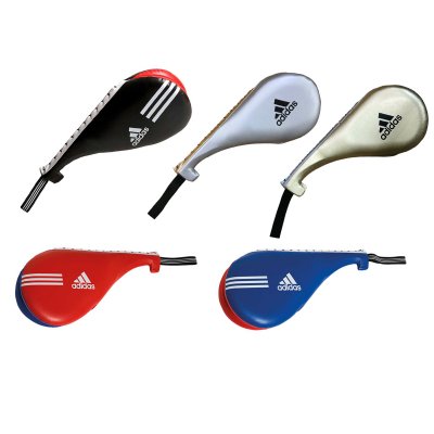 Adidas double vinyl taekwondo pads. A forearm stopper and grip provide a secure hold. Total length approximately 45 cm, maximum width approximately 21 cm. Ideal for practicing technique and tactics.