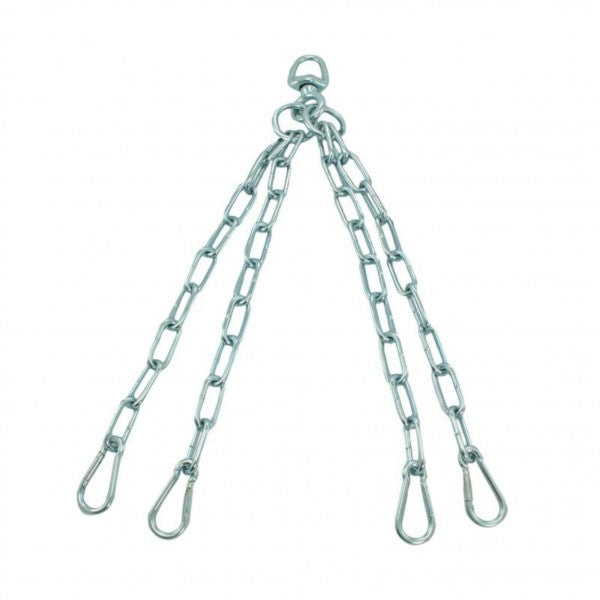 Configurazione a 4 Catene (Lunghezza 46 cm): Questa robusta sospensione è dotata di 4 catene di fissaggio e un girello a 360° che previene la torsione delle catene stesse. Quattro moschettoni garantiscono una presa sicura quando il sacco da boxe è in movimento, ideale per un'installazione standard e stabile.
