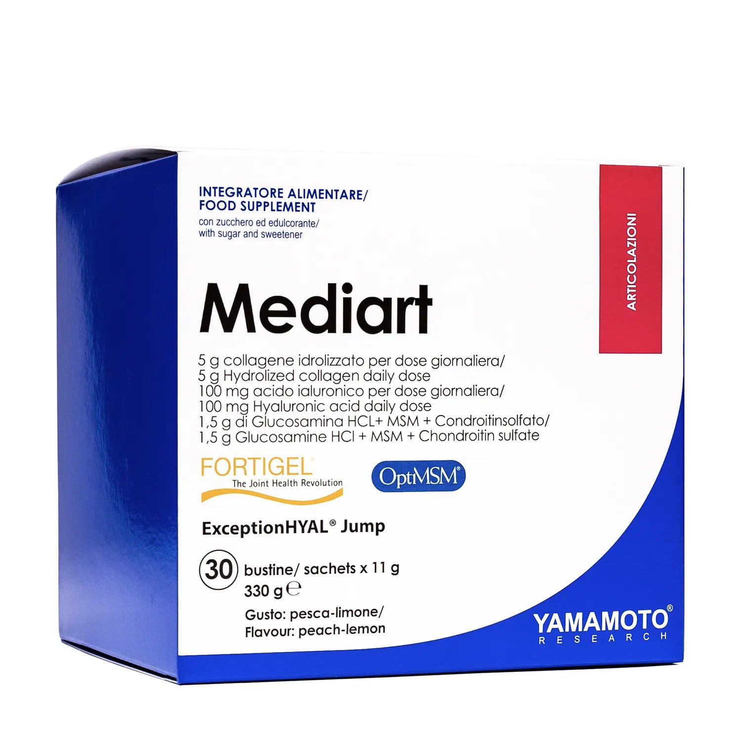 Il tipo di acido ialuronico che contiene Mediart è ExceptionHYAL® Jump un ingrediente biotecnologico appartenente all'ultima generazione degli Ialuronani, basato su uno specifico e selezionato spettro di pesi molecolari. Questa forma altamente biodisiponibile di acido ialuronico apporta un sostanziale benessere e funzionalità articolare durante l'esercizio fisico intenso, favorendo l'autorigenerazione endogena dell'acido ialuronico nel liquido sinoviale, minor dolorabilità, maggiore lubrificazione delle articolazioni ed un seguente miglioramento della funzionalità articolare.